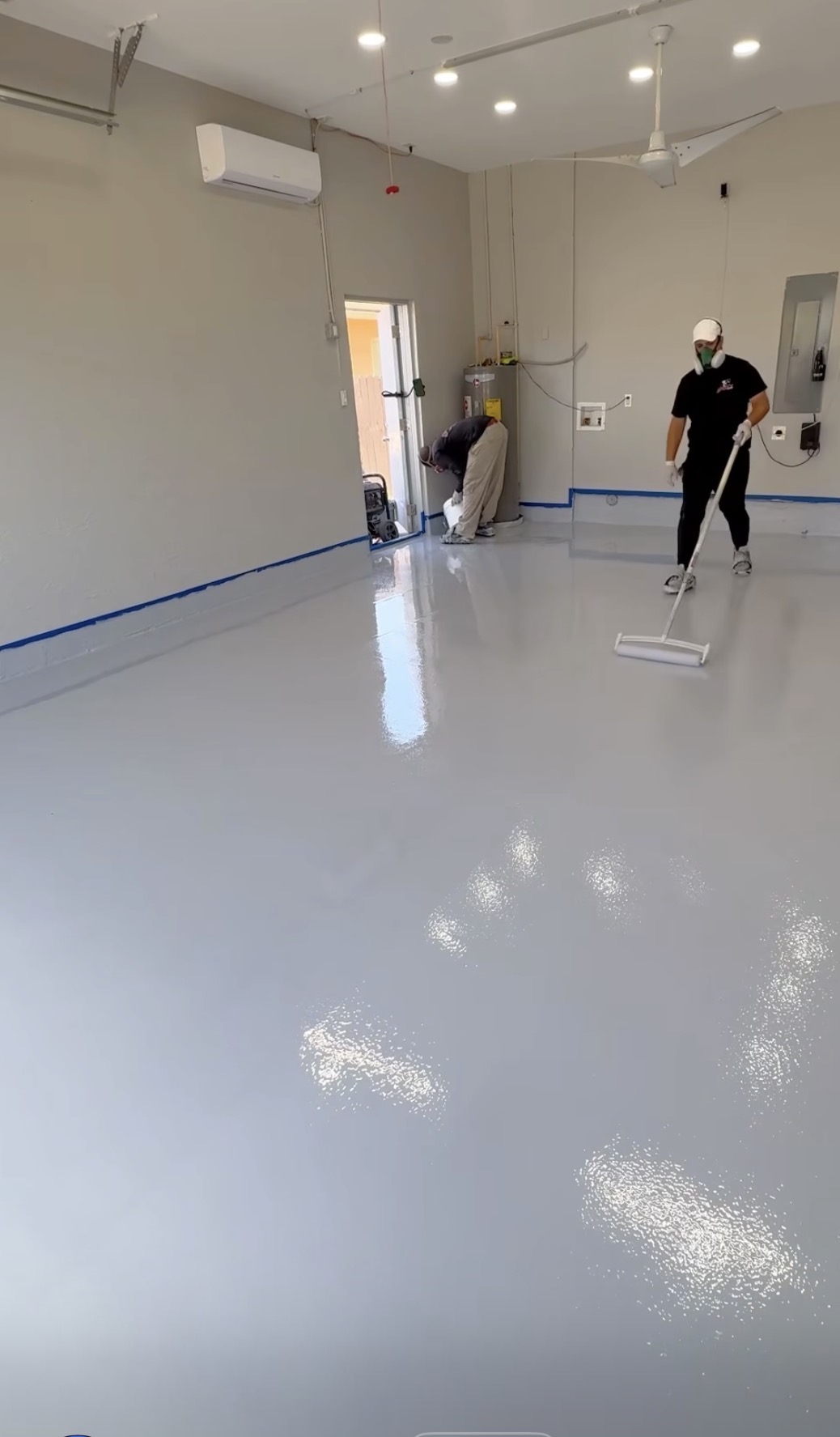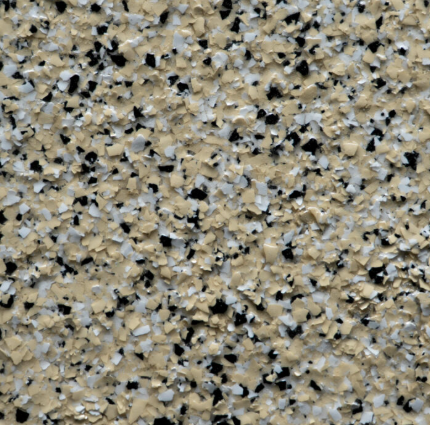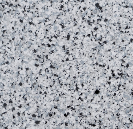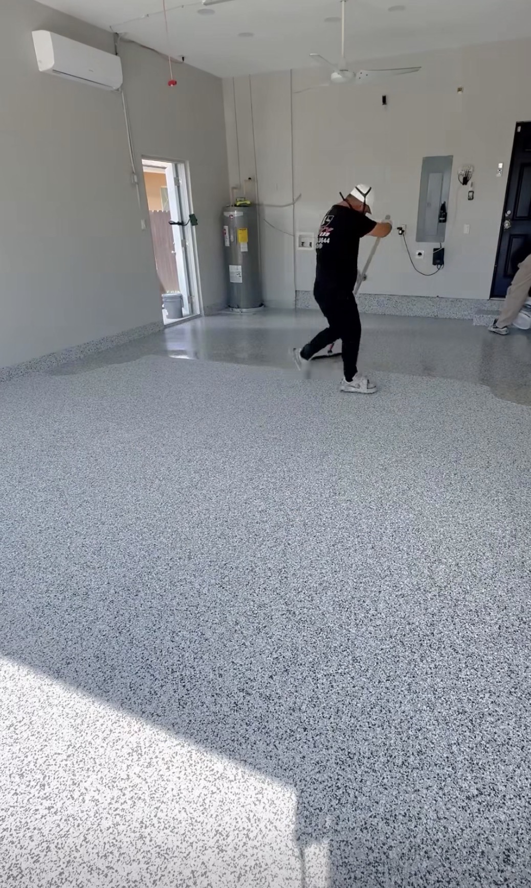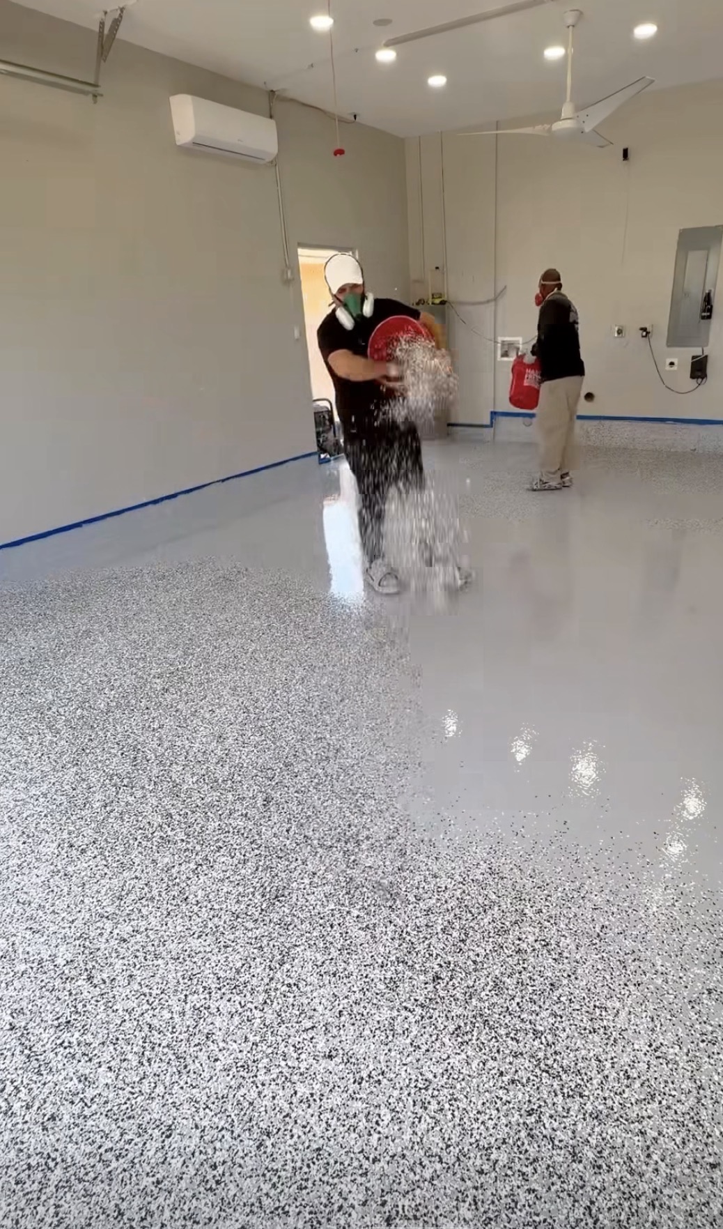 Les paillettes sont projetées à la main, le surplus aspiré, puis une finition polyaspartique est appliquée pour un sol de garage durable, résistant aux pneus chauds, aux taches, aux UV, antidérapant et facile d’entretien, pour une résistance optimale dans le temps.