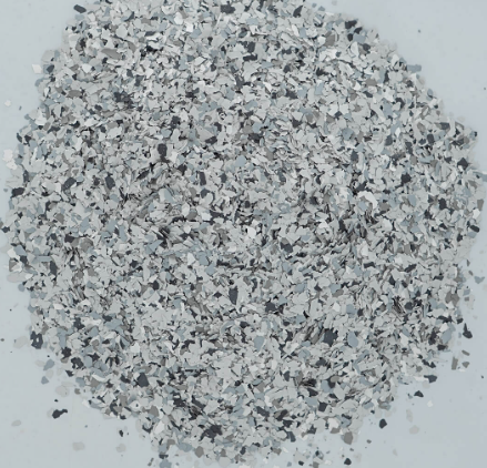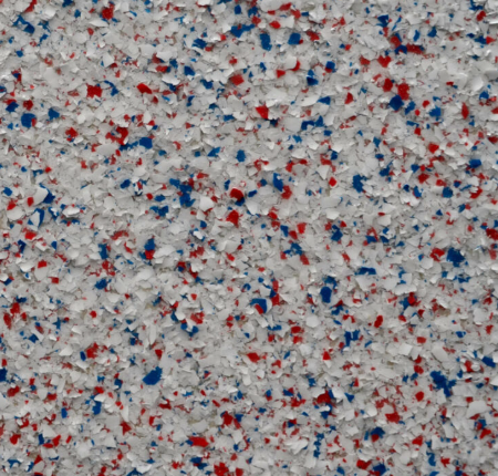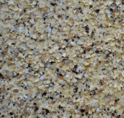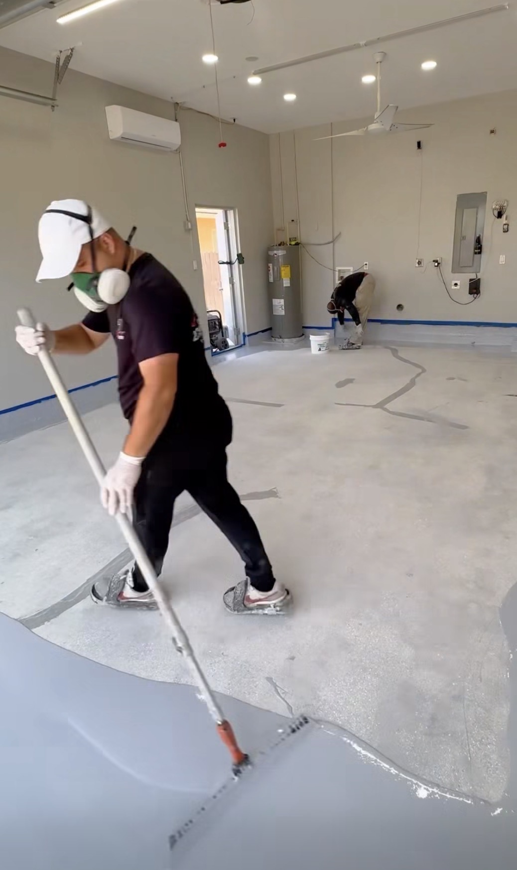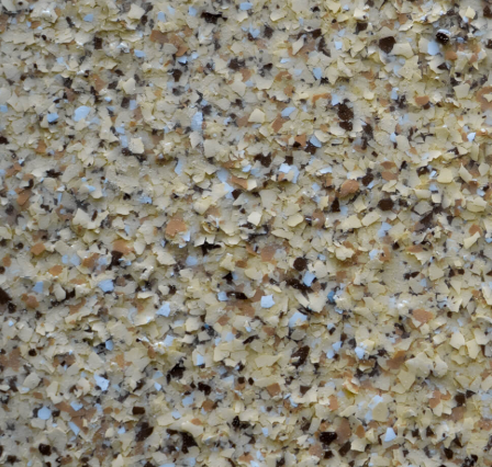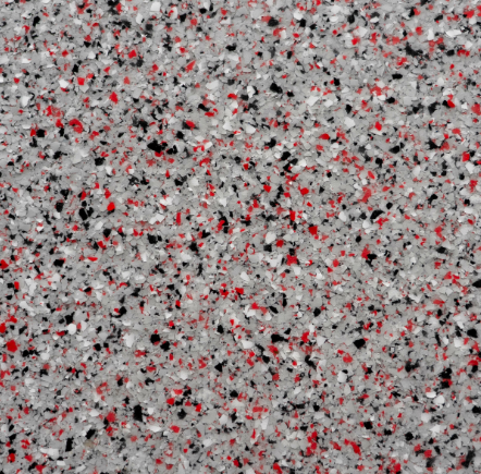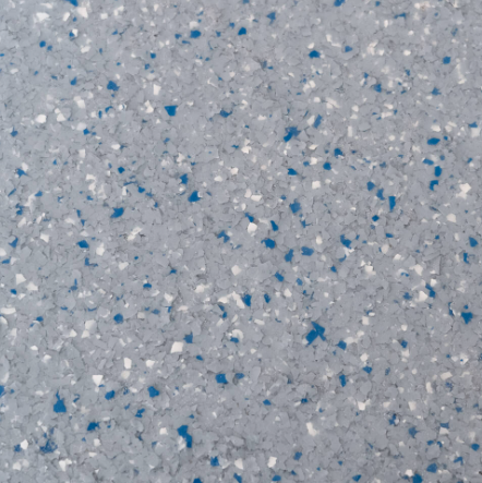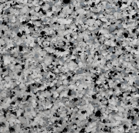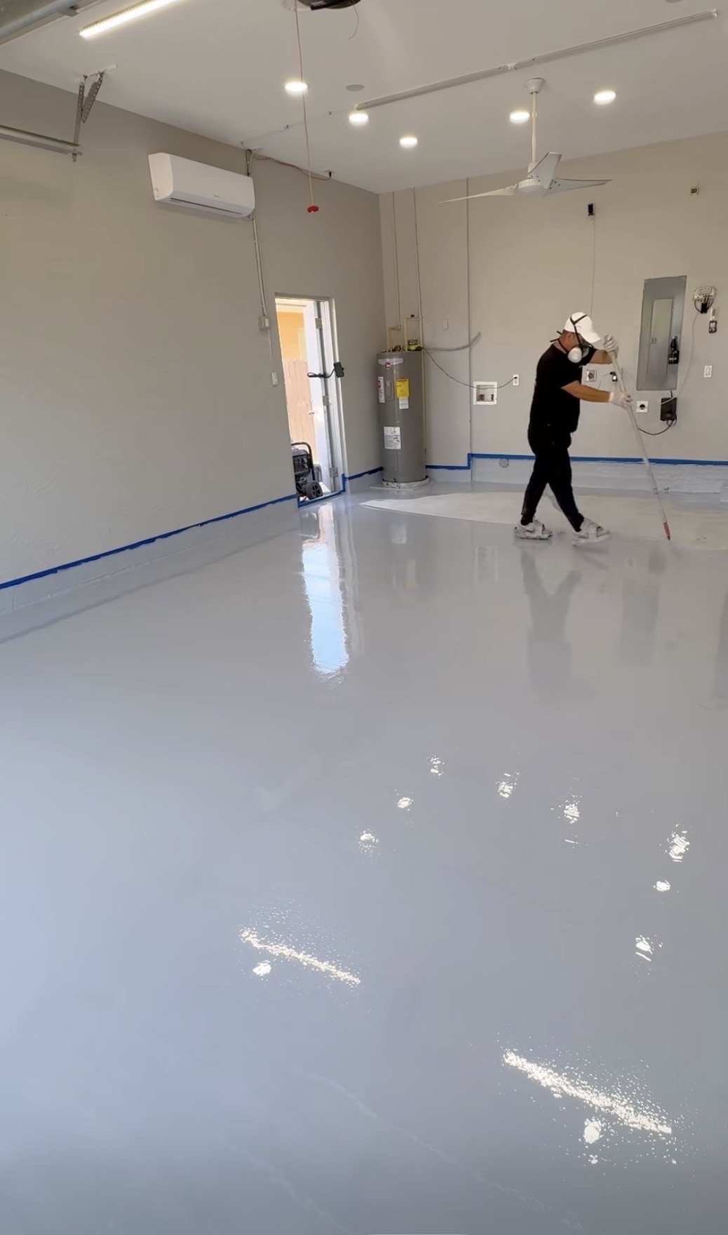 Les paillettes sont projetées à la main, le surplus aspiré, puis une finition polyaspartique est appliquée pour un sol de garage durable, résistant aux pneus chauds, aux taches, aux UV, antidérapant et facile d’entretien, pour une résistance optimale dans le temps.